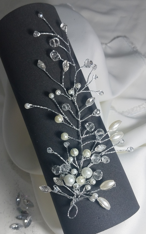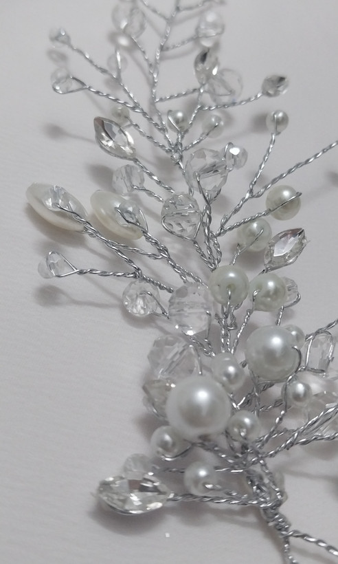 این کنار سری تاج با طول تقریباً ۱۵ سانت طراحی شده و ترکیبی از مروارید و کریستال است. قسمت پایین آن پر و چشمنواز است و هرچه بالاتر میرود، طراحی خلوتتر شده و انتهای تاج باریک میشود. این طراحی باعث میشود تاج روی سر بهطور طبیعی و متوازن جلوه کند.