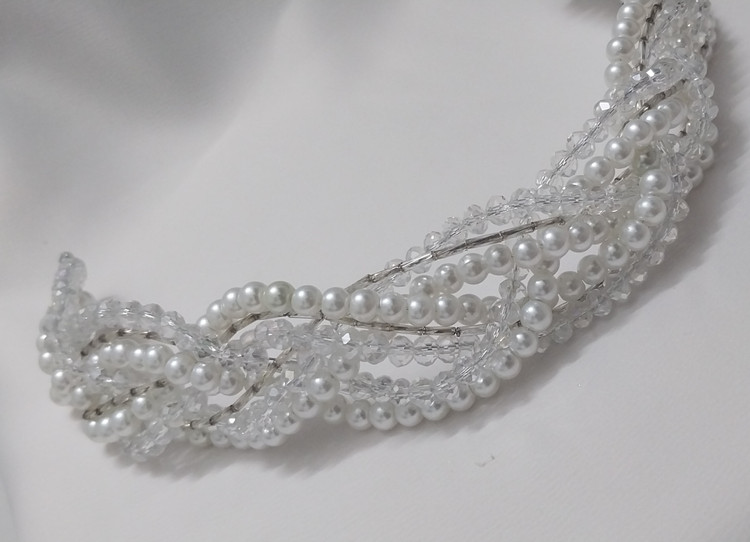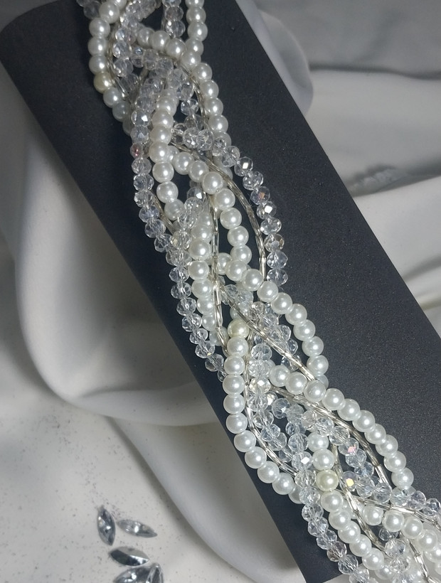 این ریسه خاص با استفاده از چند متریال مختلف (کریستالهای درخشان، مرواریدهای براق و نگینهای ظریف) ساخته شده و بافتی شبیه گیس پر و حجیم دارد. طراحی منحصربهفرد آن باعث شده جلوهای لوکس و متفاوت داشته باشد و بهخوبی روی موها بنشیند.