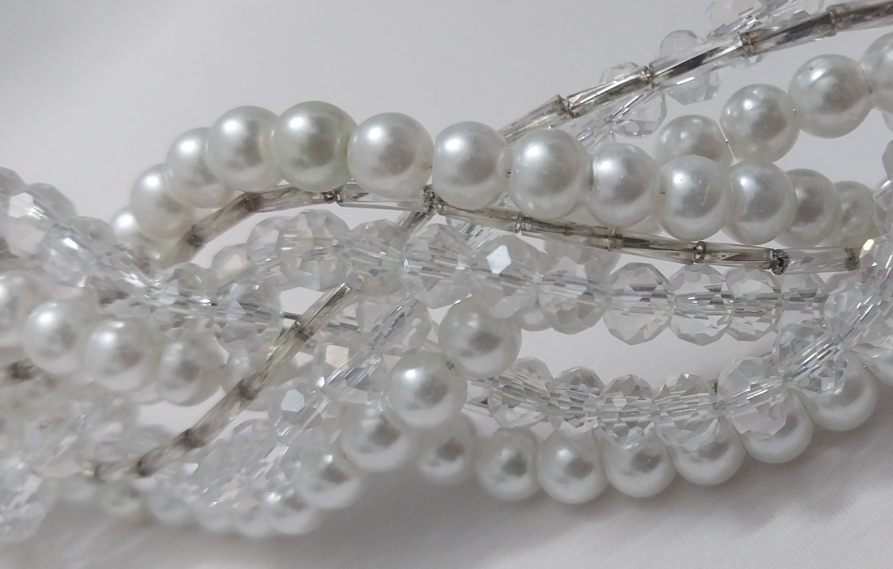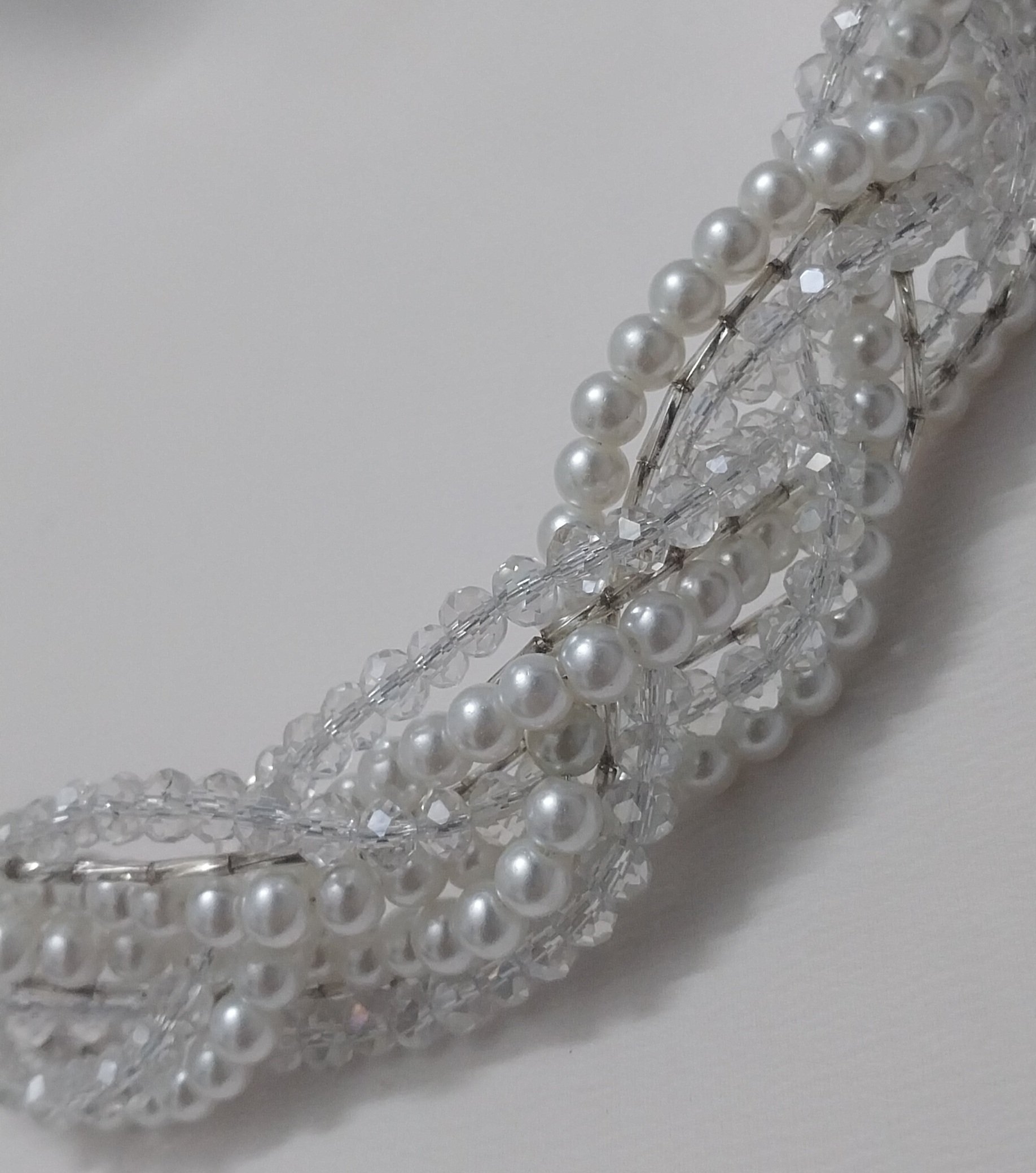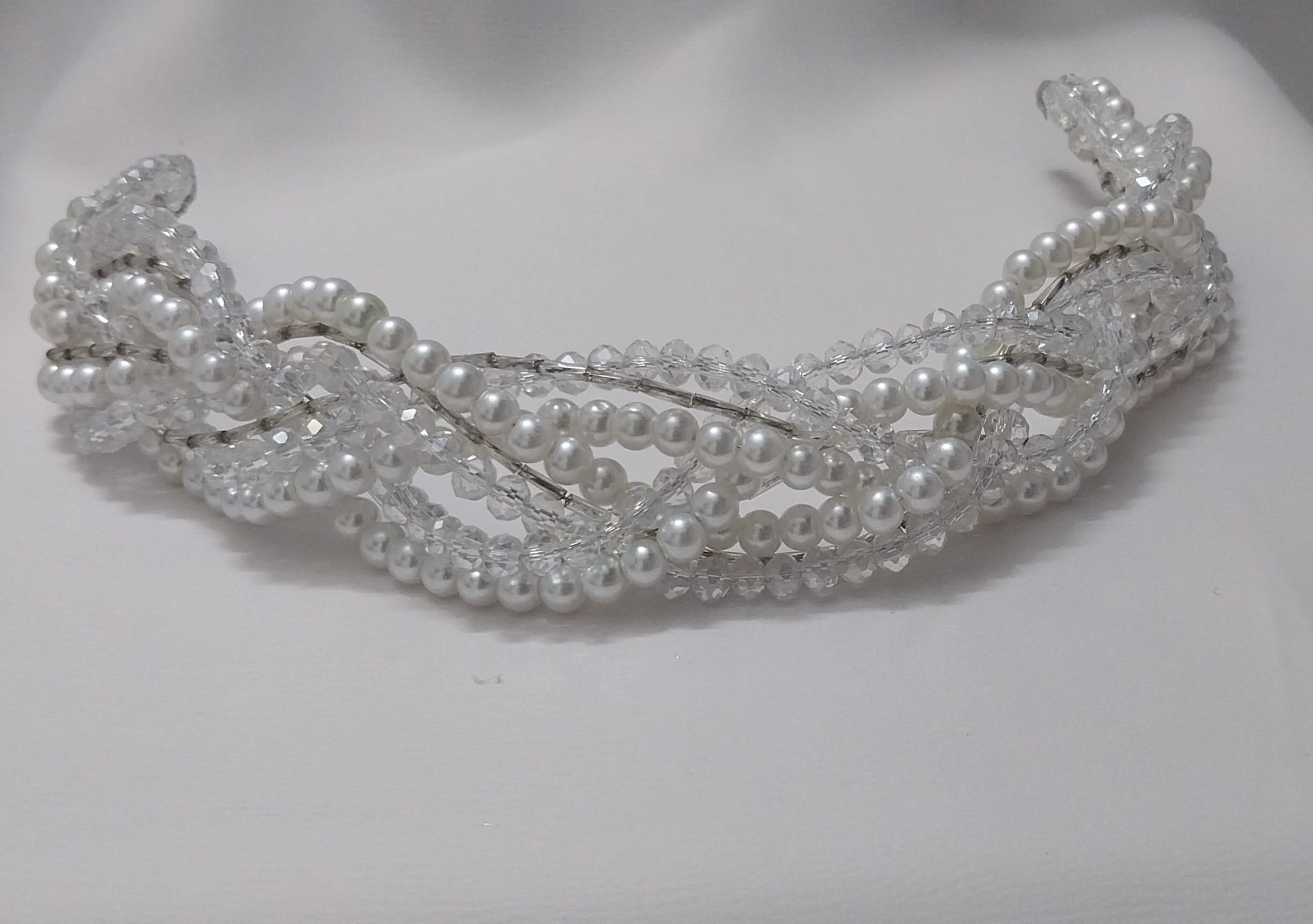 این ریسه خاص با استفاده از چند متریال مختلف (کریستالهای درخشان، مرواریدهای براق و نگینهای ظریف) ساخته شده و بافتی شبیه گیس پر و حجیم دارد. طراحی منحصربهفرد آن باعث شده جلوهای لوکس و متفاوت داشته باشد و بهخوبی روی موها بنشیند.